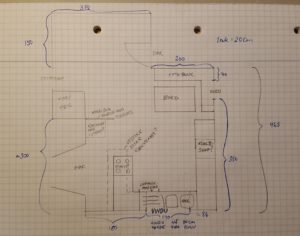Min første skisse for å illustrere størrelsen på kjøkkenet og hva vi så for oss. Komfyren har byttet plassering i ettertid.